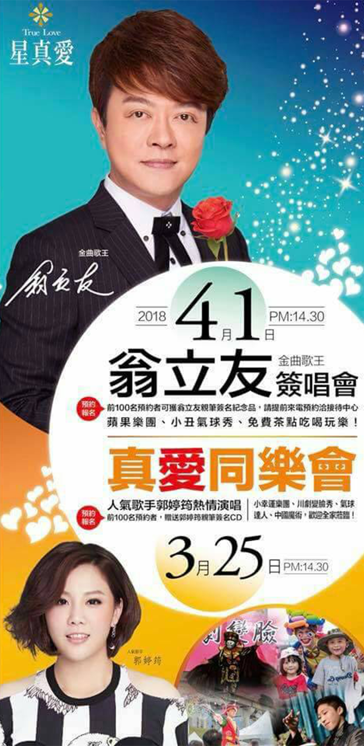 「星真愛」今天舉行真愛同樂會活動,除了有胖卡餐車、辣妹勁歌熱舞之外,還請來該案代言人金曲歌王翁立友,果然吸引大批民眾參加,上台第1首歌「堅持」就獲得熱烈迴響,翁立友也展現親民特色,甚至下台在人群中演唱。
