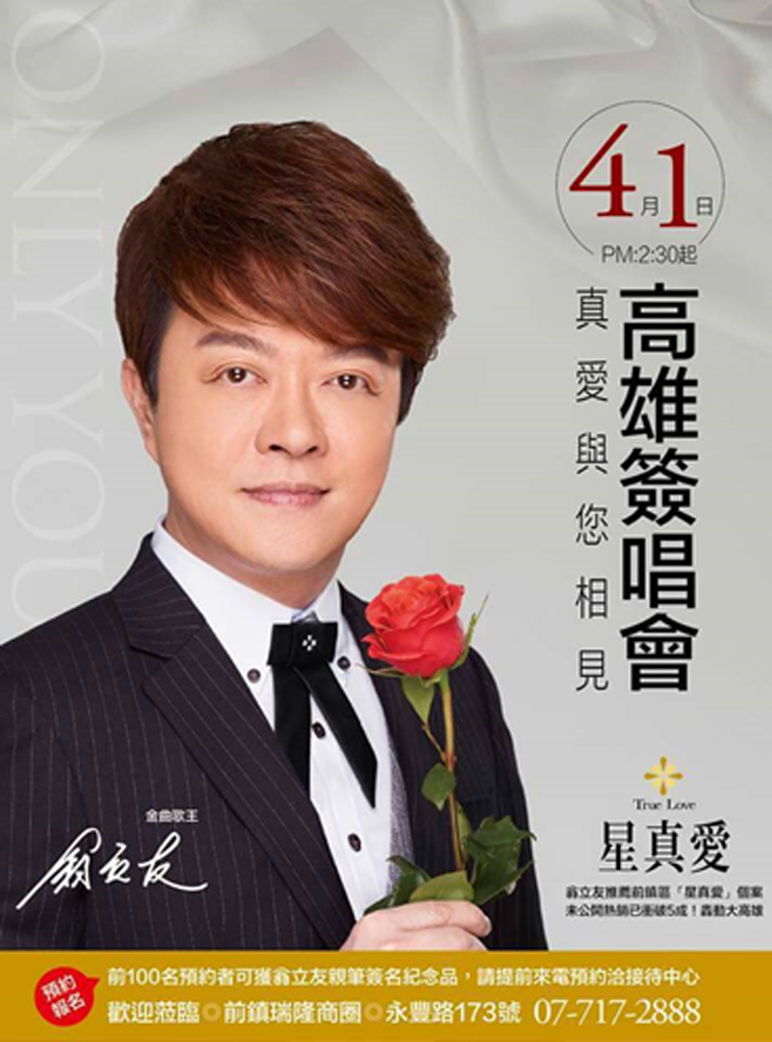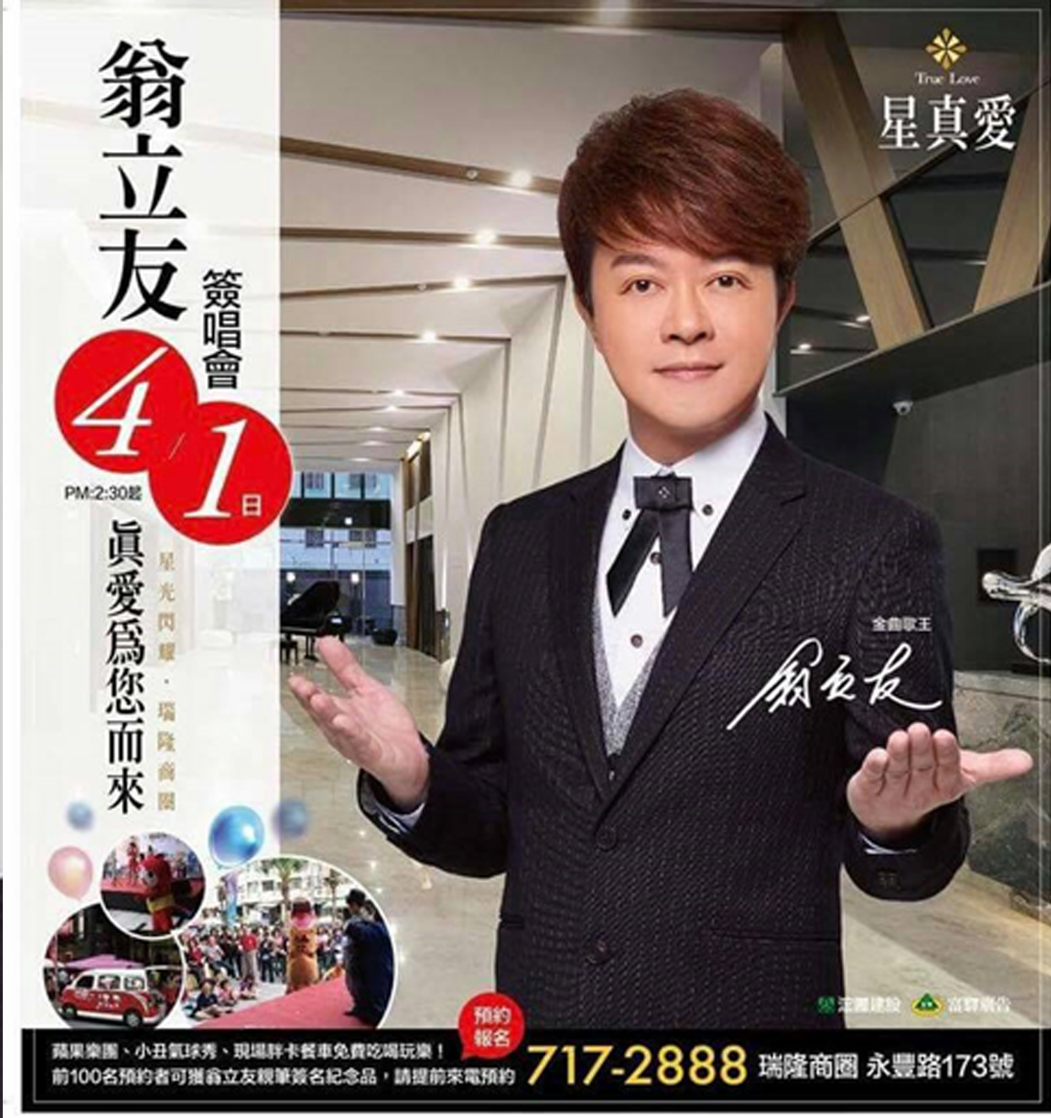 建案想要吸引民眾參加活動,抽獎、找辣妹是個方式,不過找知名影歌星站台效果也很好,高雄前鎮建案「星真愛」今天就請來代言人翁立友現場舉辦簽唱會,吸引超過300人參加,將現場擠得水泄不通,翁立友也希望自己能在高雄買戶房子,享受慢活的生活步調。
