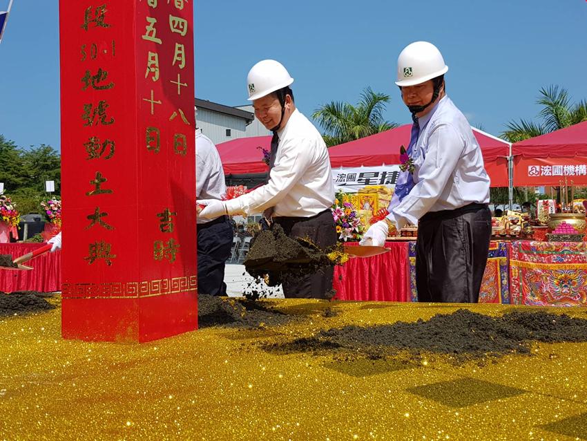 浤圃建設的「浤圃星捷座」10日上午舉行開工動土儀式,由浤圃建設董事長蘇宏圃(右一)、立永國際總經理朱建雄(右二)等人剷土。