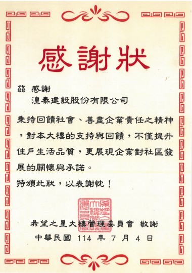 感謝 希望之星大樓管委會特別致贈感謝獎狀