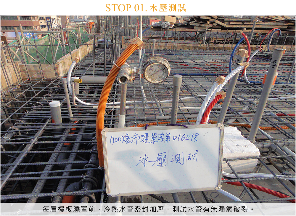 每層樓板澆置前,冷熱水管密封加壓,測試水管有無漏氣破裂。