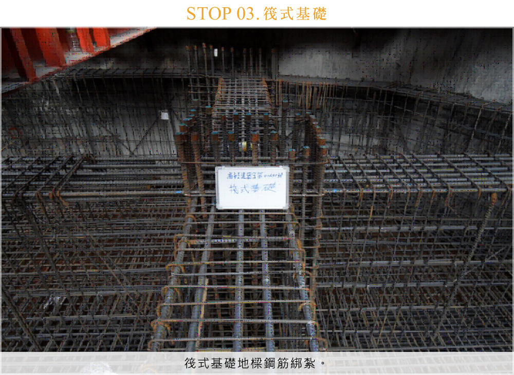 筏式基礎地樑鋼筋綁紮。
