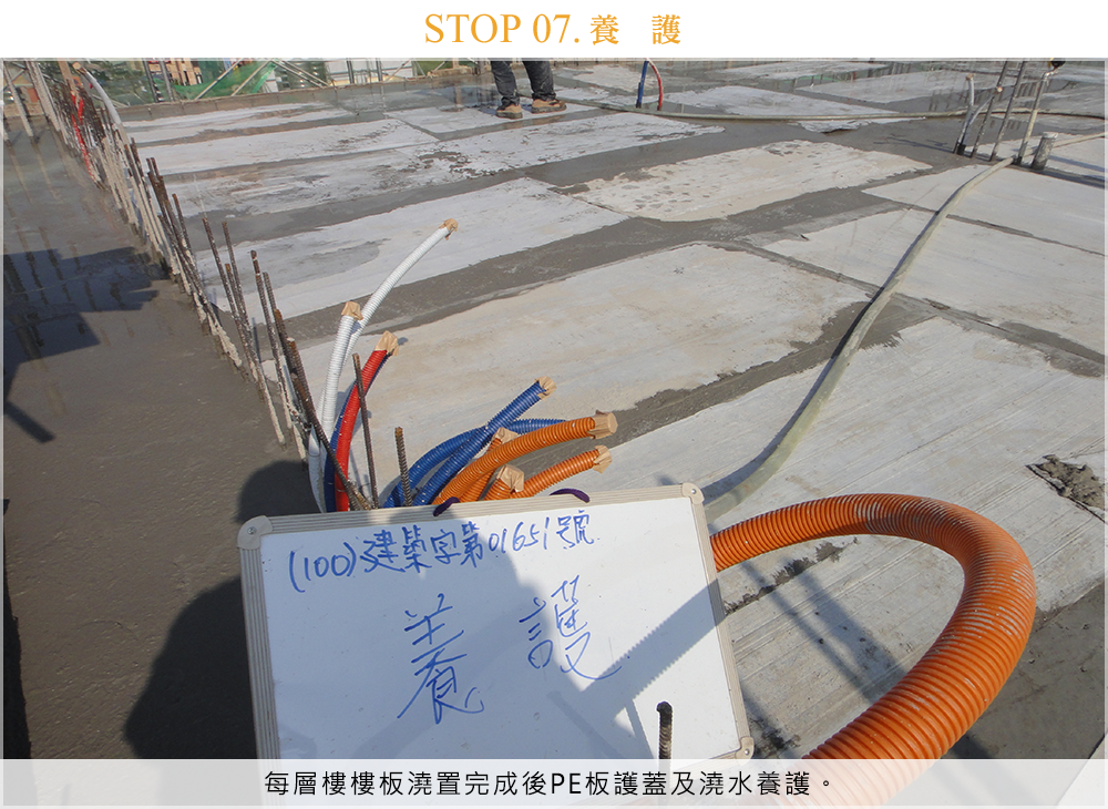 每層樓樓板澆置完成後PE板護蓋及澆水養護。