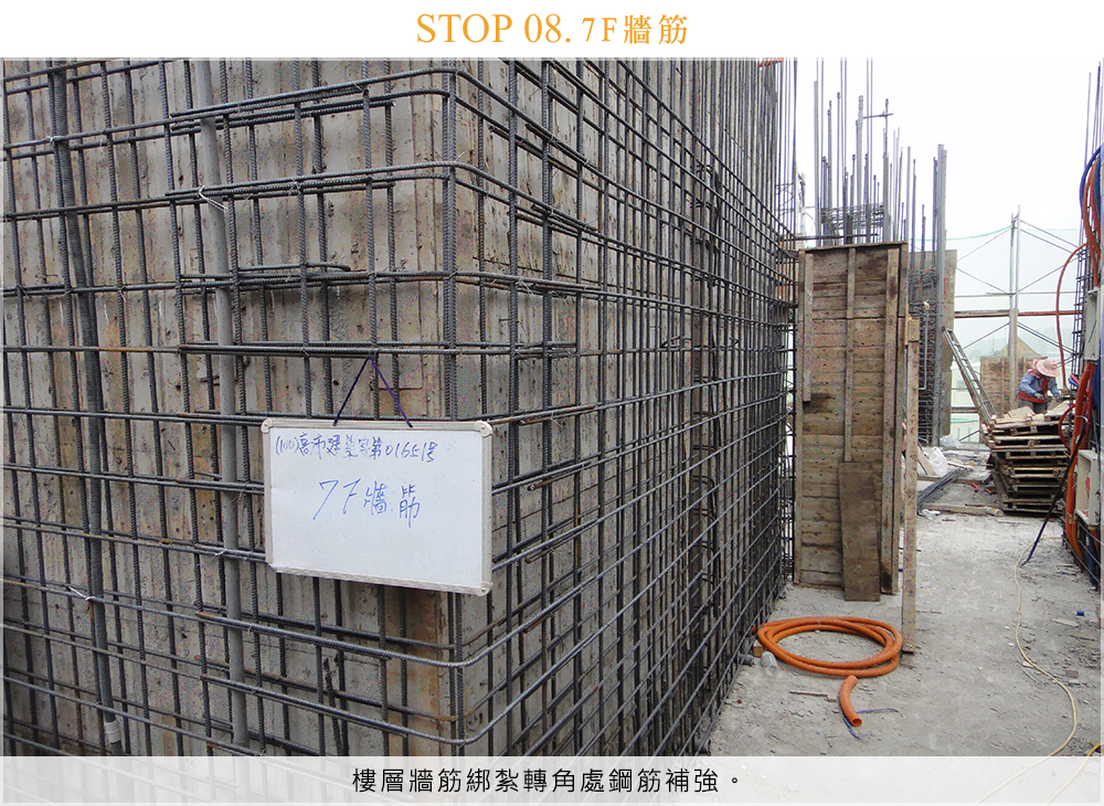 樓層牆筋綁紮轉角處鋼筋補強。